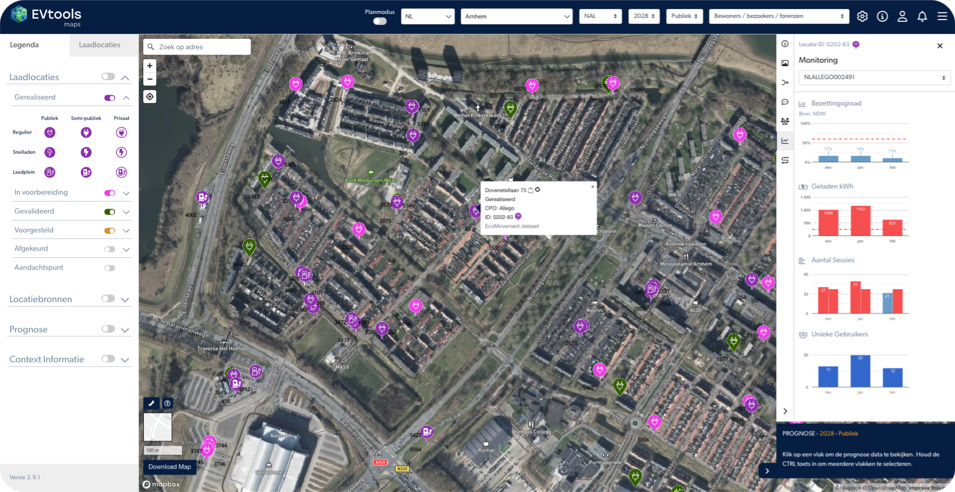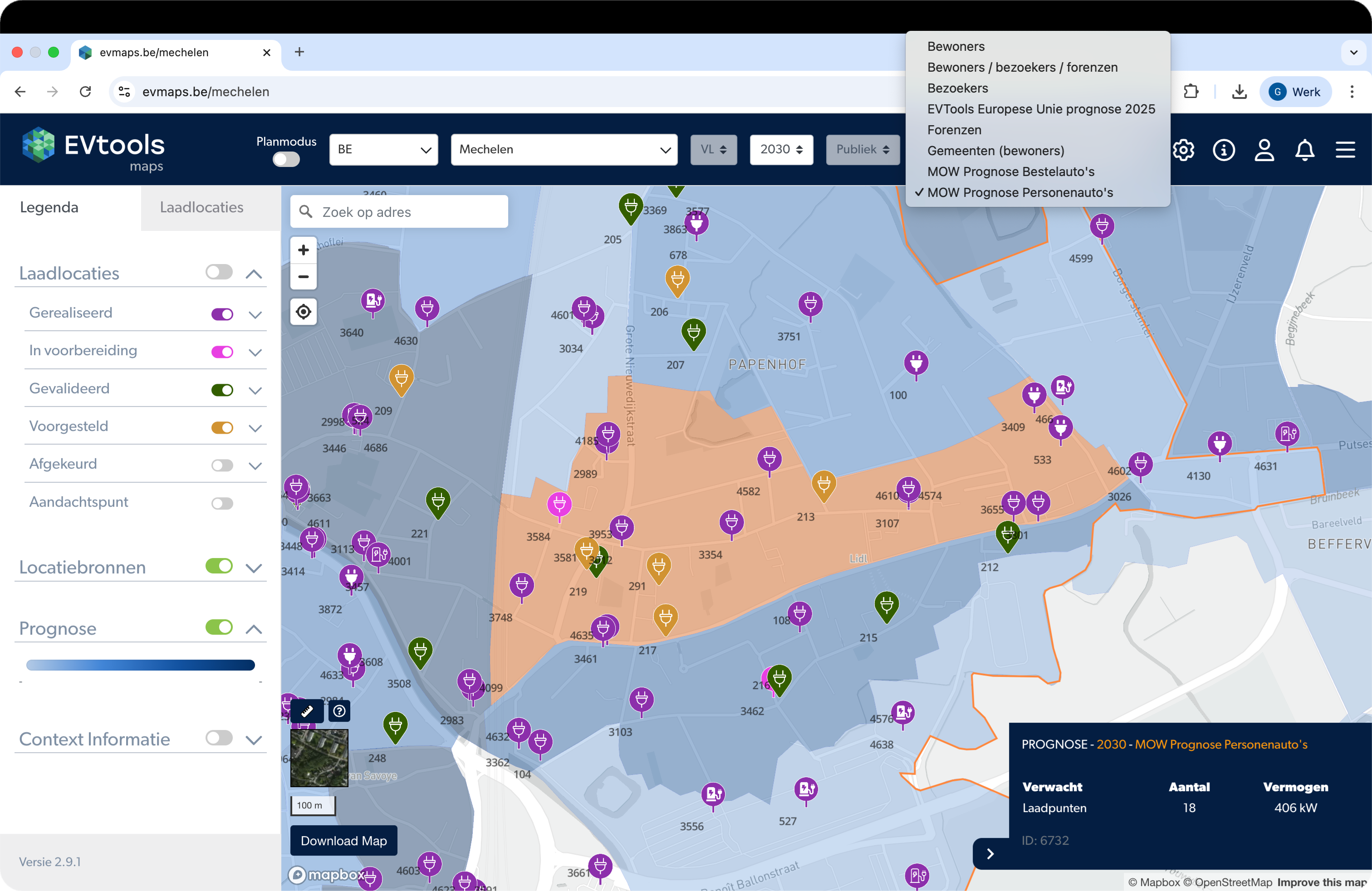 Voor alle Vlaamse steden en gemeenten zijn prognosekaarten op buurtniveau toegevoegd. Deze kaarten tonen de verwachte vraag naar laadinfrastructuur in 2028 en 2030, opgesteld door het Departement Mobiliteit en Openbare Werken (MOW). Wanneer een potentieelkaart wordt opgesteld o.b.v. deze prognose weet u zeker dat uw plaatsende CPO voldoende locaties heeft om te realiseren.