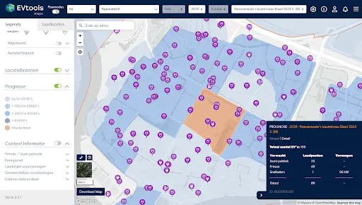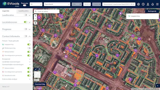 EVTools maakt gebruik van de Basisregistratie Grootschalige Topografie (BGT), bestaande verbruiksdata, toekomstprognoses, gegevens over het laagspanningsnet en lokale criteria zoals parkeervakken of bomenkaarten.
