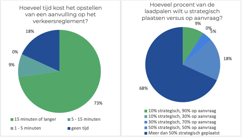 Waar bewonersinspraak nauwelijks tot vertraging leidt, blijken administratieve procedures een grotere hindernis voor de uitrol van laadinfrastructuur. Bij 73% van de gemeenten kost een aanvulling van het verkeersreglement meer dan 15 minuten, terwijl 9% aangeeft dat dit tussen de 5 en 15 minuten duurt. Dit toont aan dat automatisering van dergelijke processen waardevol kan zijn voor gemeenten. Opvallend is dat 18% aangeeft hier geen tijd voor te hebben, wat kan wijzen op een gebrek aan capaciteit of prioriteit.