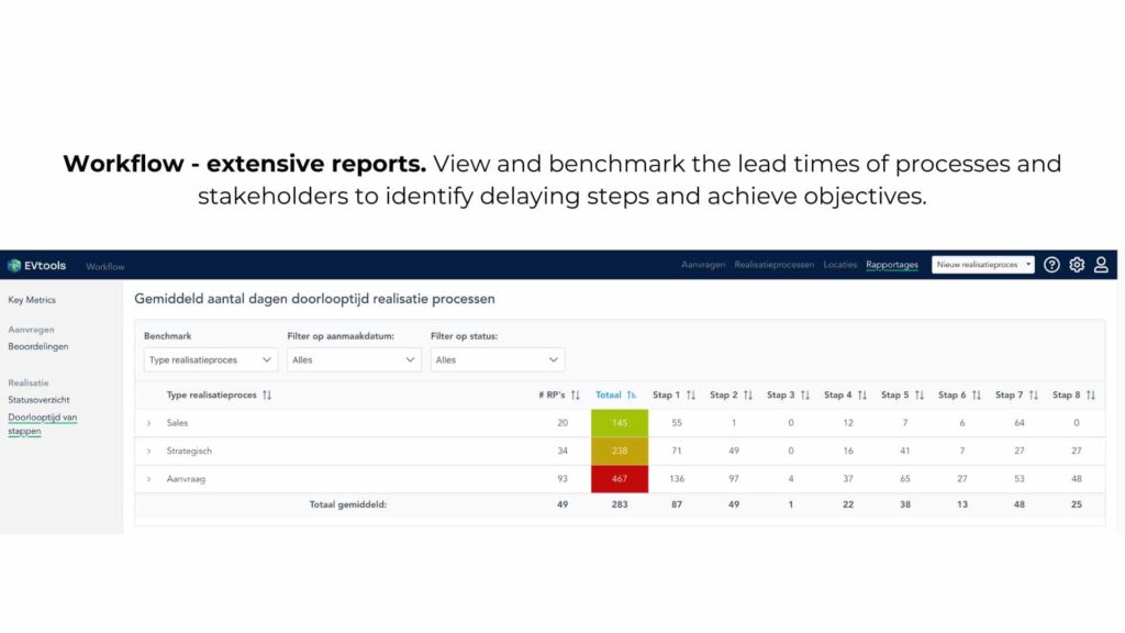 Bekijk en benchmark doorlooptijden van processen en betrokkenen om vertragingen te identificeren.